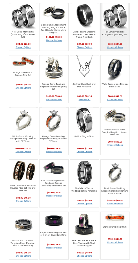 Southern Sisters Designs offers these camo rings for many occasions, for couples, for individuals delivered at your doorstep. They have all types of camo rings available in many sizes, colors and many more made of silver, tungsten, camo with stones attached to it, camo with cubic zirconia, titanium with CZ stone and camouflage bands etc. They have one of the best quality jewelry and rings.